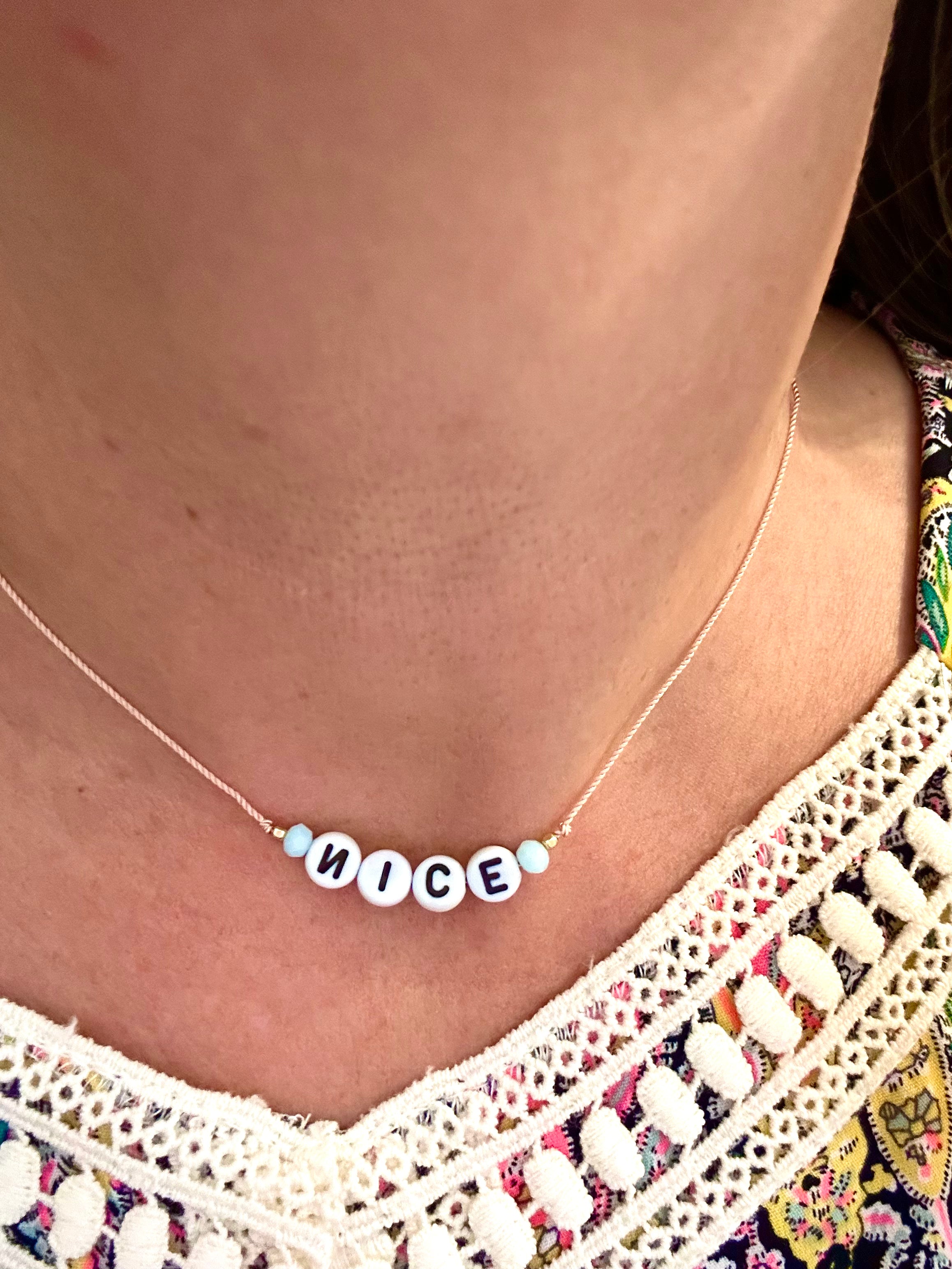 Remind yourself and others to be NICE with this Letter and gemstone necklace.