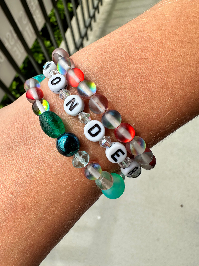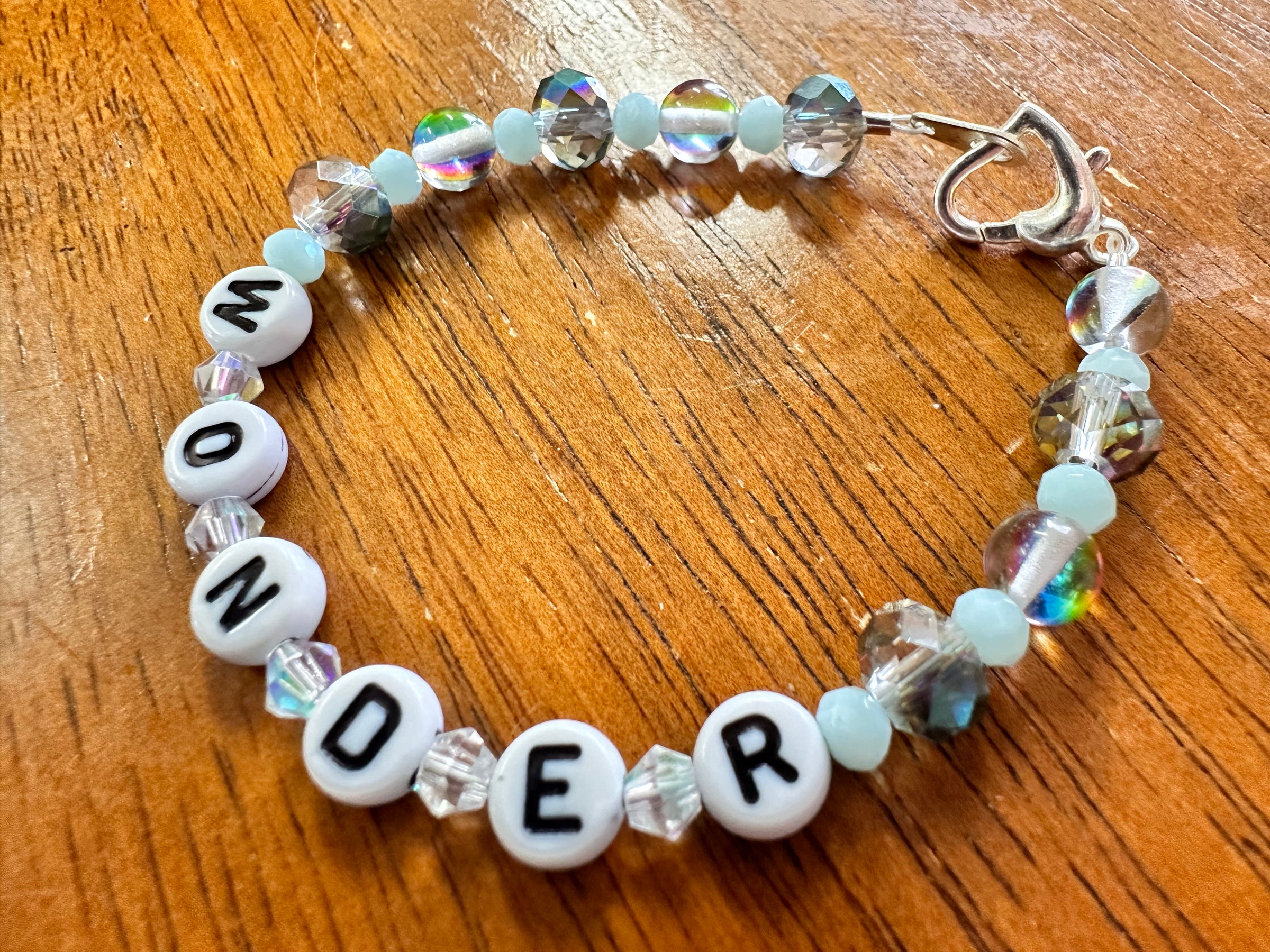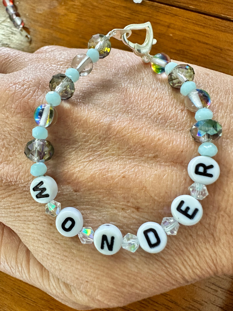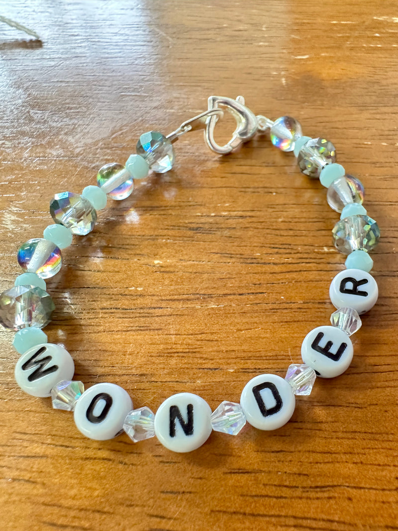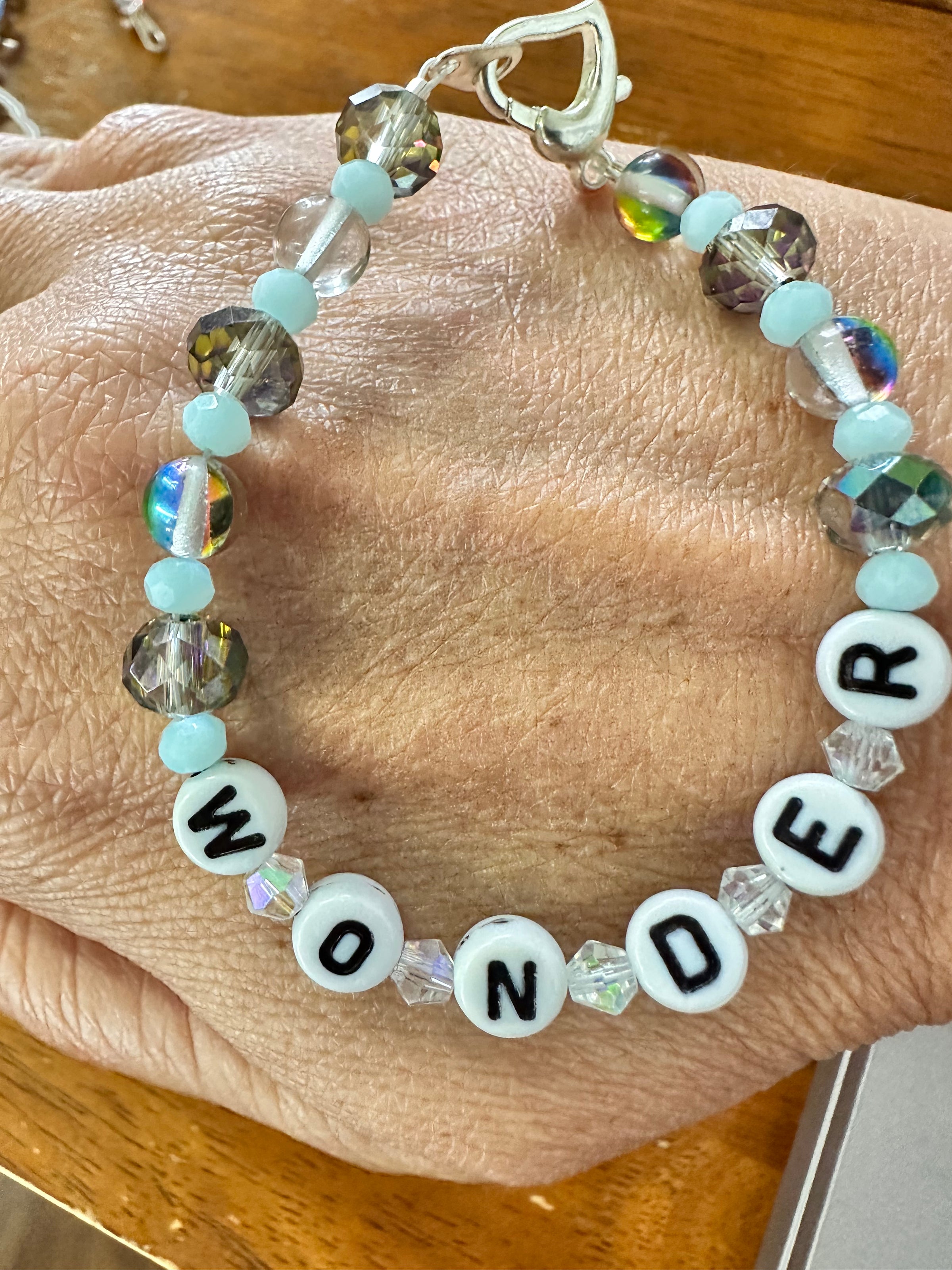 Made with gemstones, Swarovski crystals, and letters that spell out the word Wonder.